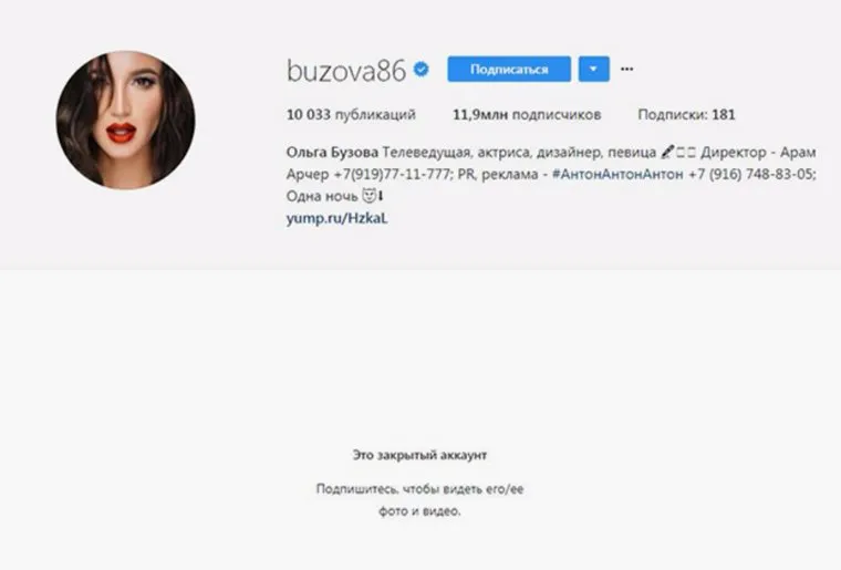 Певица и телеведущая Ольга Бузова ограничила доступ к своему аккаунту в Instagram (деятельность запрещена в РФ) для тех, кто не является ее подписчиками. На странице Бузовой появилась заглушка «Это закрытый аккаунт».