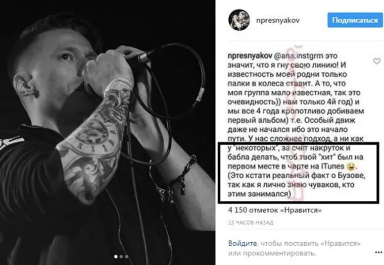 Об этом Пресняков сказал между делом, рассказывая, чем сейчас занимается его группа: «У нас сложнее подход, а не как у „некоторых“, за счет накруток и бабла делать, чтоб твой „хит“ был на первом месте в чарте ITunes. Это, кстати, реальный факт о Бузовой, так как я лично знаю чуваков, кто этим занимался».
