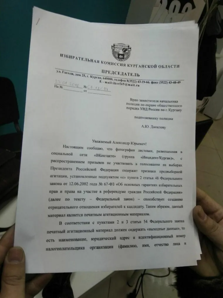 Как пояснила Радаева, 24 января УМВД по городу Кургану было возбуждено административное производство по статье 5.12 КоАП («Изготовление, распространение или размещение агитационных материалов с нарушением требований законодательства о выборах и референдумах»). В штабе проходит изъятие печатной продукции, силовики работают по заявлению избирательной комиссии. Сотрудников штаба ознакомили с заявлением председателя облизбиркома Валерия Самокрутова. В нем указано, что в группе во «ВКонтакте» была размещена фотография листовки с призывом не участвовать в голосовании на выборах президента РФ. Она «содержит признаки предвыборной агитации — способствует созданию отрицательного отношения избирателей к кандидату». Агитка была изготовлена и распространена с нарушением действующего законодательства: на ней не указаны выходные данные, и до начала распространения она не была представлена в ЦИК или избирком Курганской области, отмечается в заявлении.