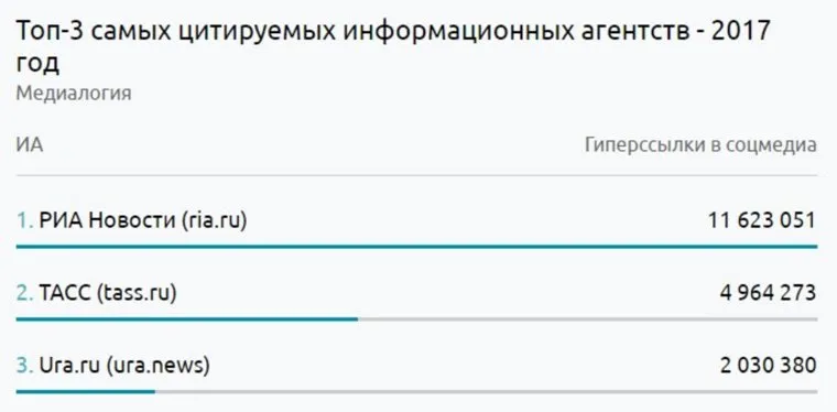 Информационное агентство «URA.RU» вошло в тройку самых цитируемых СМИ России в 2017 году после РИА «Новости» и ТАСС. Крупнейшее сетевое агентство уральского региона заняло третье место, набрав более двух миллионов гиперссылок в соцмедиа.