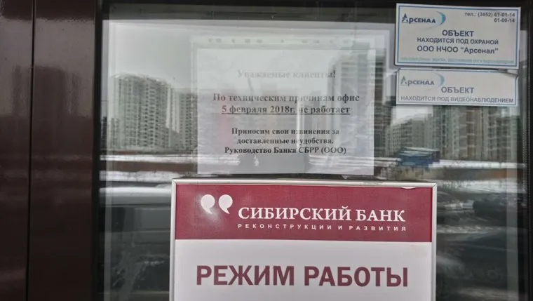 В Тюмени закрыты офисы «Сибирского банка реконструкции и развития» (СБРР). На дверях размещены объявления о том, что банк временно работает в условиях ограничения участия в обмене электронными сообщениями. Отправка платежей через платежную систему Банка России осуществляется на бумажном носителе, в связи с чем имеются задержки по сроку отправки.