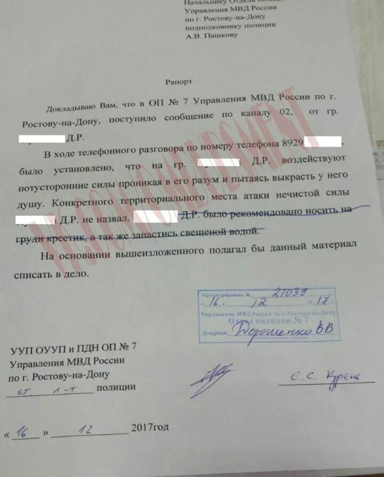 Необычный полицейский рапорт об отказе в возбуждении дела попал в Сеть. Офицер из Ростова докладывает своему начальнику о том, что дал заявителю рекомендации носить нательный крестик и запастись святой водой. Эти меры он счел достаточными, чтобы списать в архив обращение о помощи.