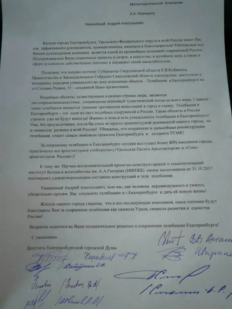 «Подобные объекты, существующие в разных странах мира, являются достопримечательностями, создающими огромный туристический поток со всего мира. Главное — такие телебашни являются точками притяжения инвестиций в город, страну. Телебашня в Екатеринбурге — это одно из двух подобных сооружений в России. Таких объектов в России строить уже не будут никогда. Именно в этом и есть уникальность телебашни в Екатеринбурге! Она, без преувеличения, могла бы стать не просто архитектурной доминантой нашего города, но и символом региона и всей России. Убеждены, что сохранение и дальнейшая реконструкция телебашни станут самым знаковым проектом Екатеринбурга и холдинга УГМК», — сказано в обращении к гендиректору УГМК.