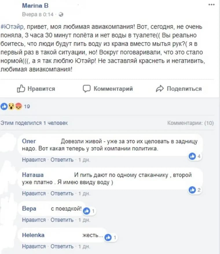 «Не очень поняла: 3 часа 30 минут полета — и нет воды в туалете. Вы реально боитесь, что люди будут пить воду из крана вместо мытья рук? Я в первый раз в такой ситуации, но! Вокруг поговаривали, что это стало нормой, а я так люблю ЮТэйр! Не заставляй краснеть и негативить, любимая авиакомпания!» — написала она в сообщении.