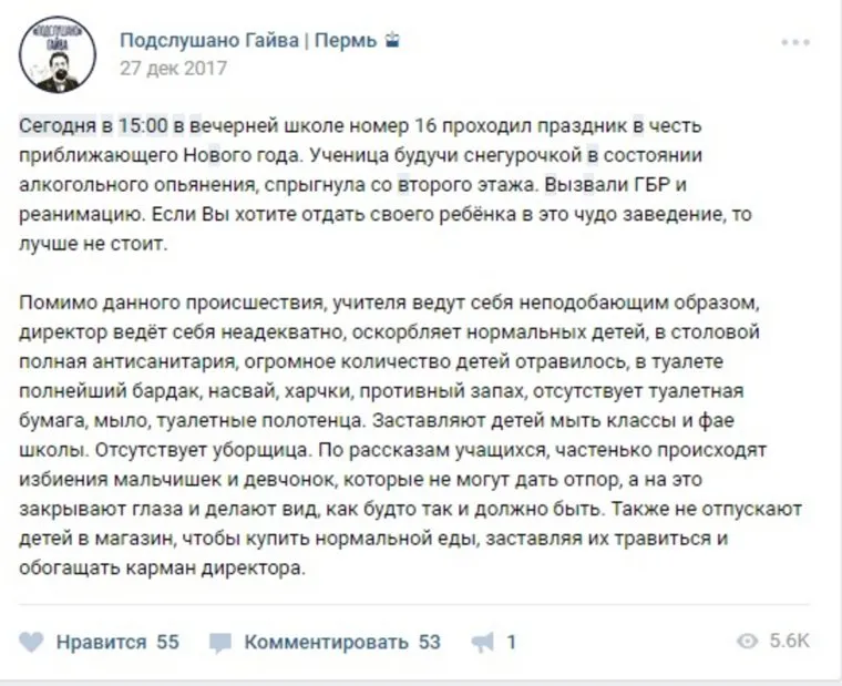 Согласно материалам дела, 27 декабря 2017 года в паблике «Подслушано Гайва» в социальной сети «ВКонтакте» был опубликован пост о вечерней школе, находящейся в Орджоникидзевском районе. Автор поста сообщил, что накануне из окна второго этажа школы выпрыгнула одна из учащихся. Кроме того, там же говорилось о антисанитарии, коррупции и неподобающем поведении руководства и педагогов образовательного учреждения. «По рассказам учащихся, частенько происходят избиения мальчишек и девчонок, которые не могут дать отпор», — было написано в том сообщении.