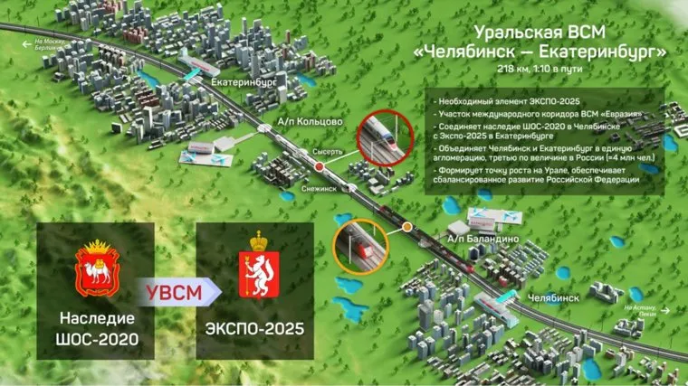 Согласно презентации, строительство Уральской высокоскоростной магистрали (УВСМ) станет важной вехой, предваряющей Всемирную выставку ЭКСПО-2025, на которую претендует Екатеринбург. Железная дорога протянется из свердловской в челябинскую столицу через Сысерть и Снежинск, где построят специальные УВСМ станции. В рамках строительства реконструируют вокзалы Екатеринбурга, Челябинска и станции Шарташ