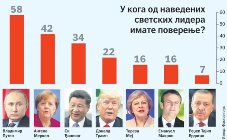 Опрос проводило сербское агентство «Фактор плус», результаты были опубликовало местное издание «Политика». Вместе с Владимиром Путиным в анкете было еще шесть глав государств: канцлер ФРГ Ангела Меркель, председатель КНР Си Цзиньпин, президент США Дональд Трамп, премьер Великобритании Тереза Мэй, президент Франции Эмманюэль Макрон и президент Турции Реджеп Тайип Эрдоган — гражданам страны предлагалось отметить, кому из перечисленных политиков они доверяют. В итоге на первом месте оказался президент России — он набрал 58%. На втором месте — Ангела Меркель, 42%.
