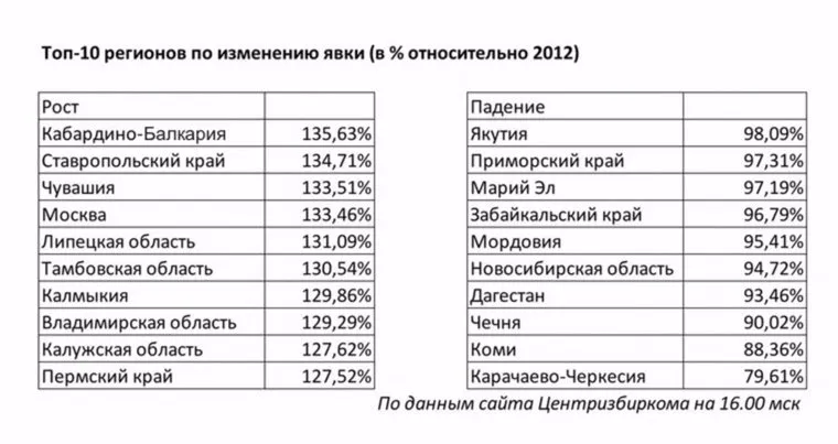 Проценты падения выглядят куда менее впечатляюще — возглавляющая рейтинг Якутия продемонстрировала почти 99% явки от показателя 2012 года. Несколько неожиданно выглядят результаты Чеченской республики — 90,02%. «Что касается „упавших“ регионов, то их результаты имеет смысл считать уже по итогам голосования, — считает Давыдов. — Повторить высокие цифры явки столь же сложно, как и добиться ее увеличения. Еще неизвестно, какая задача является более трудной». «URA.RU» следит за ходом голосования и ведет онлайн-трансляцию .
