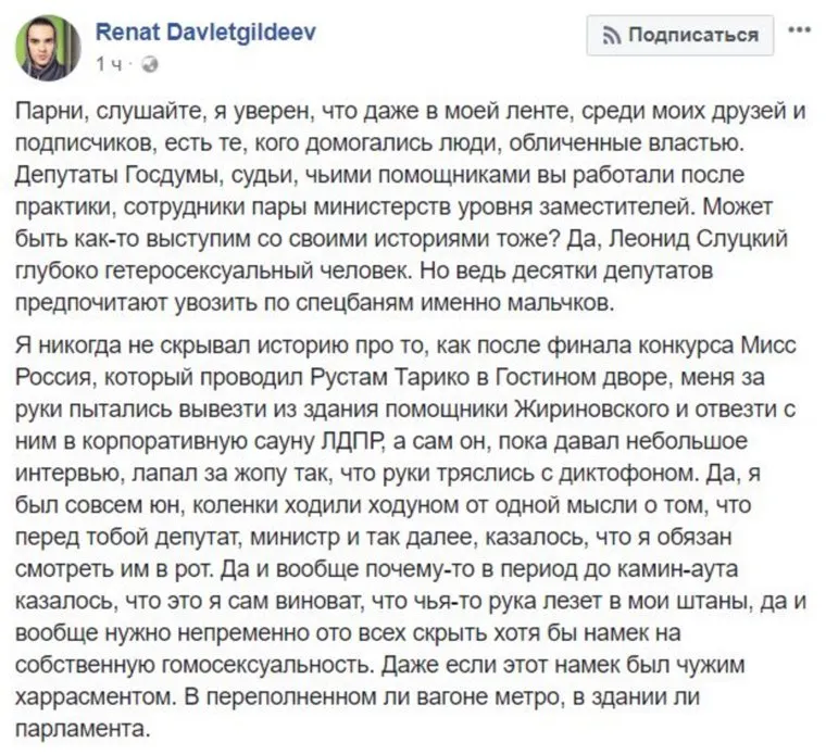 Журналист «Настоящего времени» и «Дождя» Ренат Давлетгильдеев рассказал о домогательствах со стороны депутата Госдумы, лидера ЛДПР Владимира Жириновского. Этим он поделился с подписчиками на своей странице в Facebook (деятельность запрещена в РФ).