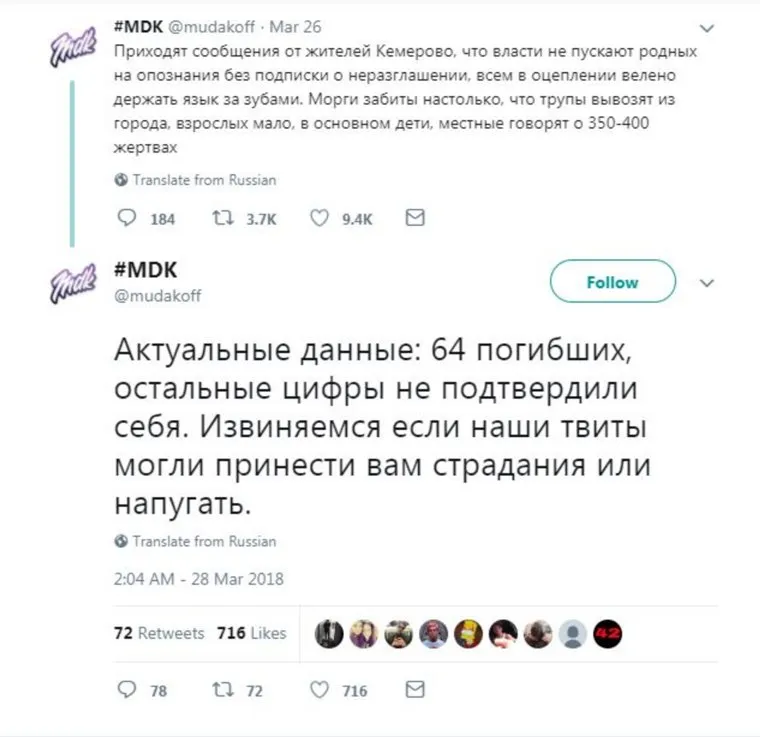 Популярное сообщество в социальных сетях MDK извинилось за распространение не соответствующей действительности информации о количестве погибших при пожаре в ТЦ «Зимняя вишня». Сообщение администраторы паблика разместили в Twitter.
