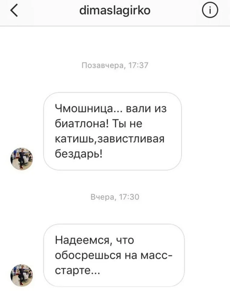 «Люди, если вы обо мне так думаете и считаете, что я заслуживаю таких слов, сидите дома и завидуйте молча!!! И не нужно подписываться на меня таким гнилым людям, как вот этот жизнью обиженный (человеком не могу назвать таких людей)», — эмоционально прокомментировала спортсменка слова незнакомца, который назвал ее «чмошницей» и призвал «валить из биатлона».