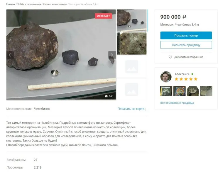 «Метеорит второй по величине из частной коллекции, более крупные только в музее. Срочно [продаю]. Отличный способ вложения средств, отличный экземпляр для коллекции, уникальный образец для исследований, а кому и просто для понта в особняке поставить. Таких больше не будет!» — написал Алексей.
