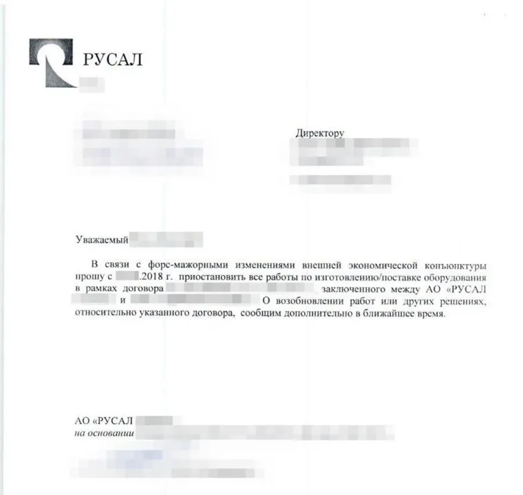 «В связи с форс-мажорными изменениями внешней экономической конъюнктуры прошу с [число] приостановить все работы по изготовлению/поставке оборудования в рамках договора, заключенного между [подразделение] АО „РУСАЛ“ и [название компании]. О возобновлении работ или других решениях относительно указанного договора сообщим дополнительно в ближайшее время», — говорится в тексте, подписанном руководителем подразделения.
