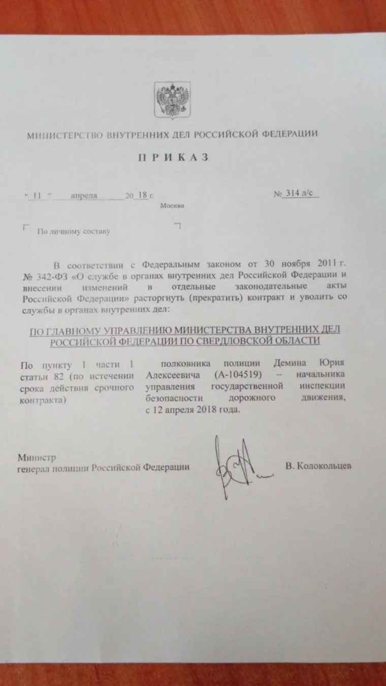 Глава МВД России Владимир Колокольцев подписал приказ об увольнении начальника УГИБДД по Свердловской области полковника полиции Юрия Демина. В распоряжении «URA.RU» оказался соответствующий документ, датированный 11 апреля текущего года.
