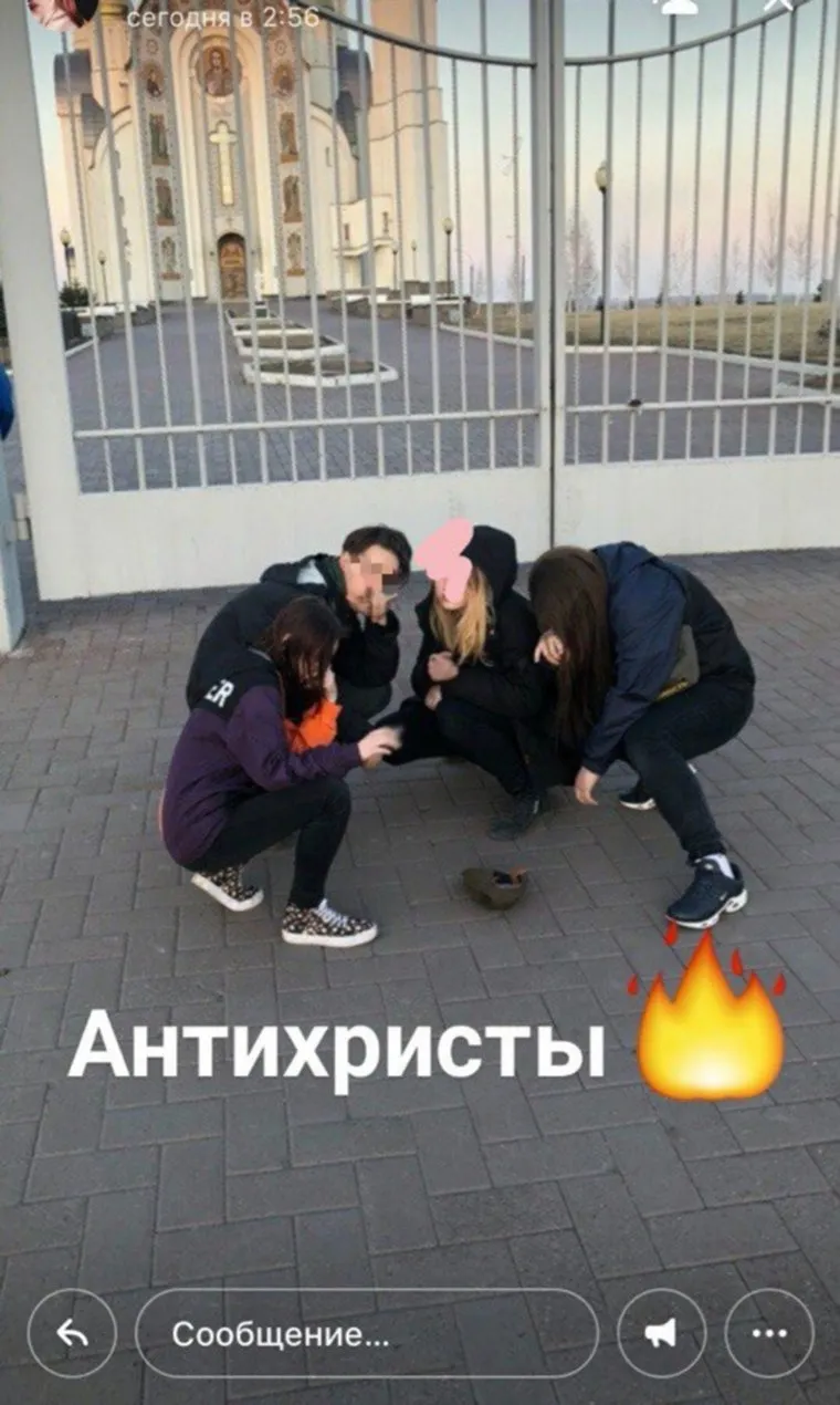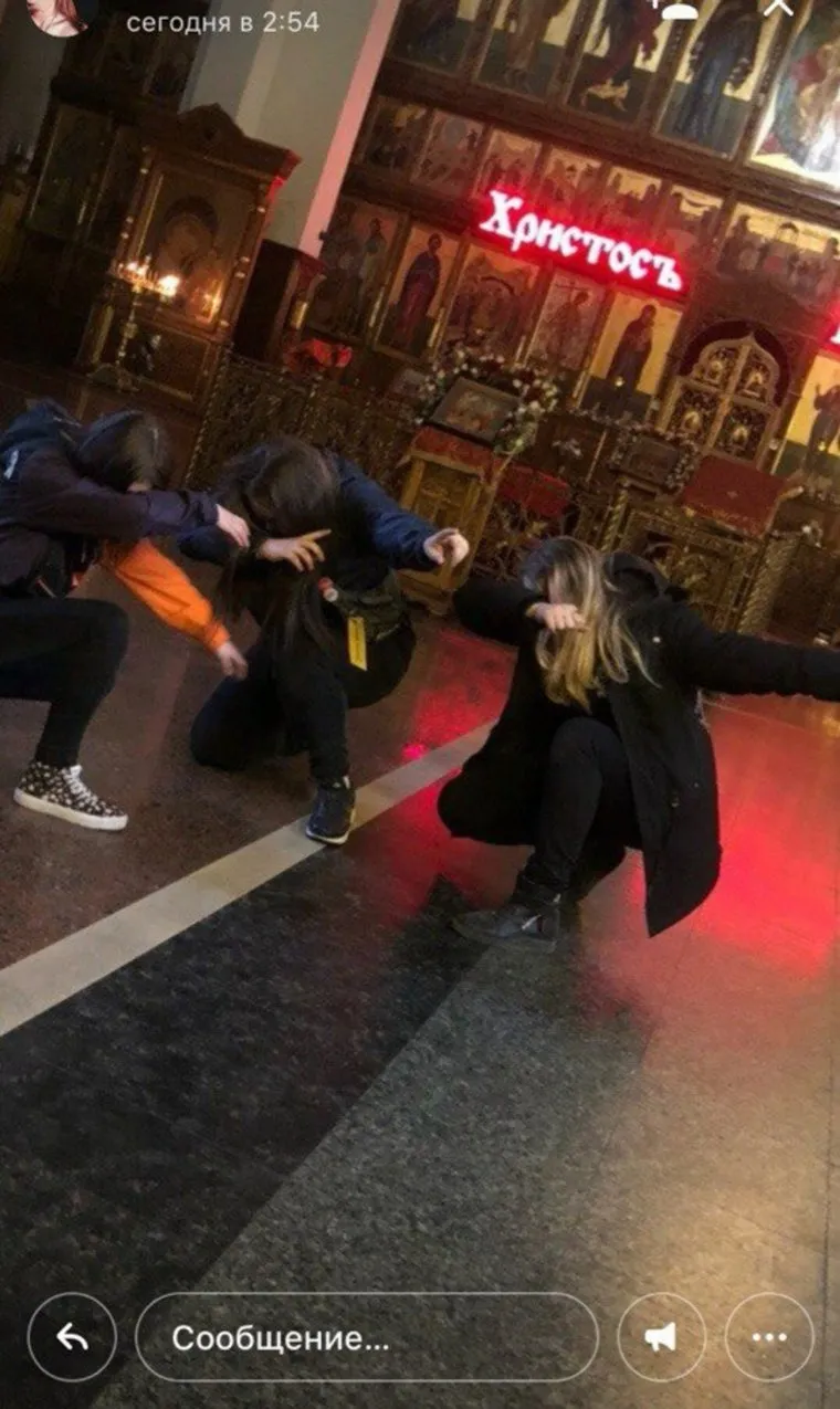 Также на фотографиях группа подростков позирует на фоне храма и икон, закрывая лицо руками. На личной странице во «ВКонтакте» у девушки, которая поделилась снимками, постоянно мелькают слова «антихайп, Антихрист» и выражение «слава Сатане». Сама себя она характеризует пословицей «в тихом омуте черти водятся», в строке «мировоззрения» у подростка указан атеизм.