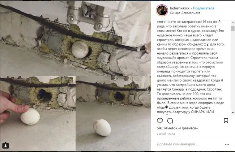 Строители ЖК «Свой круг» в Екатеринбурге оставили необычный «презент» покупателям квартир. Горожанка Эллада заехала в новостройку и нашла в стене своего жилища замурованное протухшее яйцо, издающее зловонный запах. На своей странице в Instagram (деятельность запрещена в РФ) девушка опубликовала фотографии своей находки.