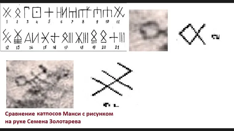 Уральский исследователь Валентин Дегтерев, который плотно занимается изучением тайны гибели группы Игоря Дятлова в 1959 году, изучил материалы вскрытия трупа самого старшего из них — Семена Золотарева. Особое внимание привлекли его татуировки, которые тот якобы нанес перед самой смертью, чтобы указать на убийц туристов.
