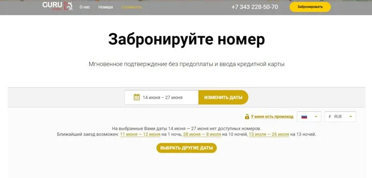 Согласно открытым источникам, отель Guru располагает не самым значительным номерным фондом — всего 25 жилых помещений. Зато гостиница находится менее чем в 500 метрах от Центрального стадиона, где пройдут матчи ЧМ-2018, и любому болельщику было бы крайне удобно там расположиться. На сайте отеля при попытке выбрать дату проживания с 14 июня по 27 июня (дни матчей ЧМ-2018 в Екатеринбурге) появляется сообщение, что доступных номеров на это время нет.