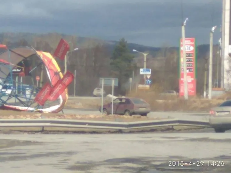 В Златоусте ветер опрокинул конструкцию на въезде в город