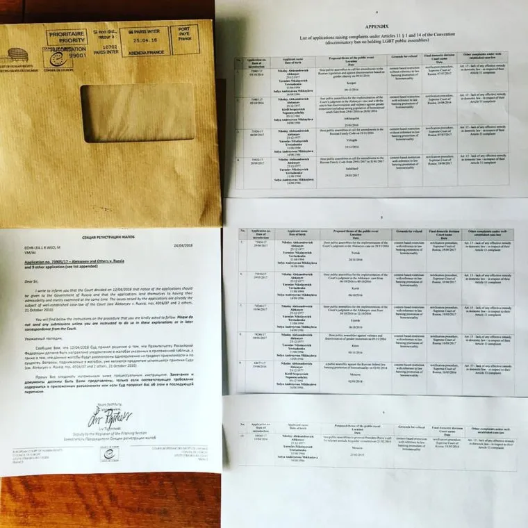 В ответе ЕСПЧ говорится, что уведомление о жалобах направлено российским властям. Объяснить запреты они должны до 17 сентября 2018 года, сообщает ЛГБТ*-активист.