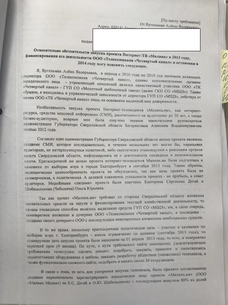 В объяснении Вугельман сказано, что канал создавался по инициативе первого заместителя руководителя администрации губернатора Свердловской области Алексея Багарякова. По его замыслу канал должен был постепенно наращивать аудиторию, не интересующуюся политикой либо скептически относящуюся к решениям органов власти Свердловской области. Информировать зрителей о деятельности власти предполагалось в сугубо положительном ключе, такой была долгосрочная программа. В реальности канал должен был не допустить победы Евгения Ройзмана на выборах мэра Екатеринбурга. После того, как выборы состоялись, финансирование канала начало сокращаться, а потом и вовсе прекратилось. Сейчас Дегай пыталась доказать в суде, что канал создавался не для получения прибыли, а для политической борьбы — поэтому и отдавать долги не обязательно.