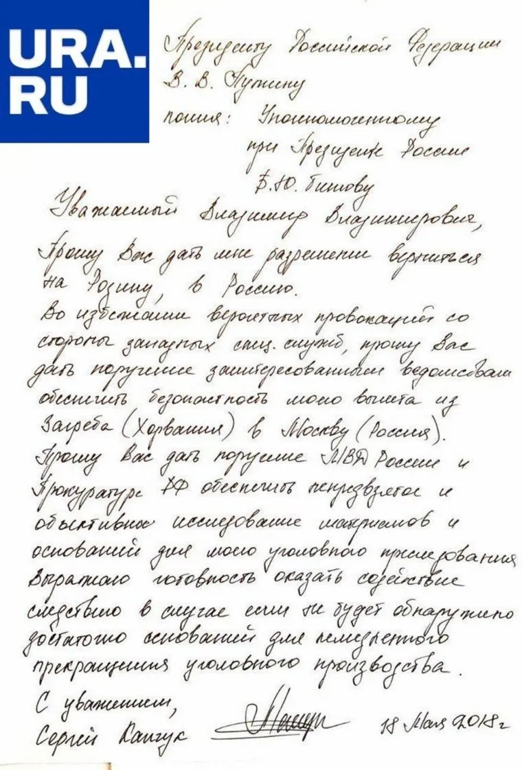 Письмо Сергея Капчука, которое оказалось в распоряжении «URA.RU» датировано 18 мая 2018 года. Сергей Капчук просит обеспечить безопасность его вылета в Россию «во избежание вероятных провокаций со стороны западных спецслужб». Кроме того, он готов к сотрудничеству со следствием. Бизнесмен просит «обеспечить непредвзятое и объективное исследование материалов и оснований» для уголовного преследования.
