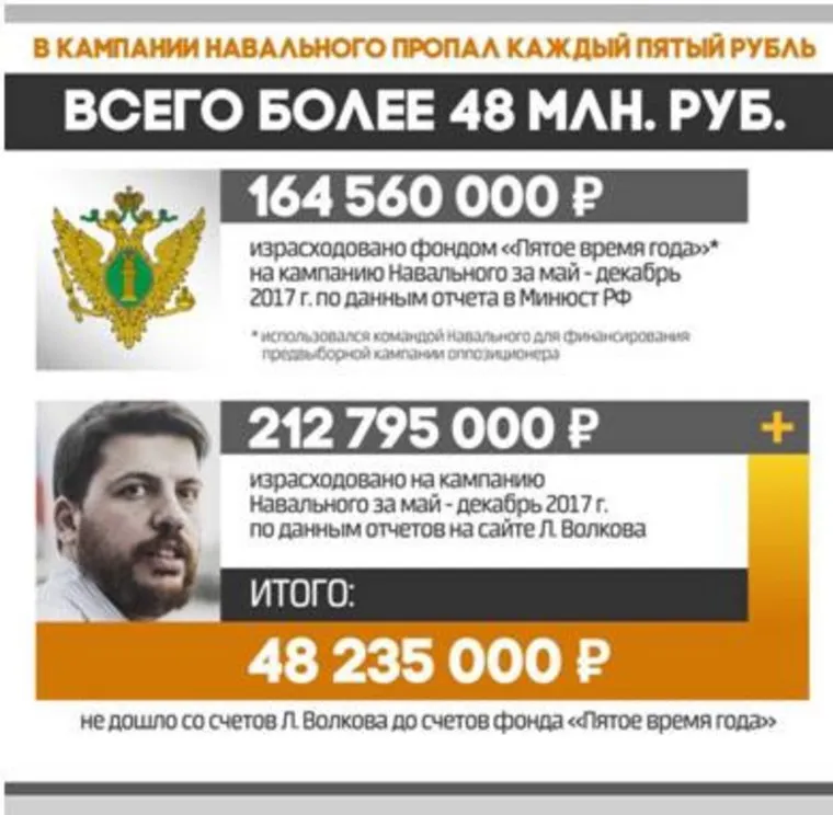Юрист отмечает, что данные о расходах фонда «Пятое время года» (использовалась для финансирования проектов Навального в 2017 и 2018 годах) не совпадают с отчетом Минюста России о данной организации. По заявлению Леонида Волкова, на кампанию за май—декабрь 2017 года было потрачено 212,7 миллиона, в то время как Министерство юстиции сообщает о 164,5 млн рублей потраченных средств за то же время. «С пожертвований в поддержку Алексея Навального пропал практически каждый пятый рубль, — говорит Виолетта Волкова. — Куда же делись и на что пошли почти 50 миллионов „пропавших“ рублей, о которых скромно умалчивают Навальный, его ближайший помощник, и фактически, заместитель Леонид Волков?»
