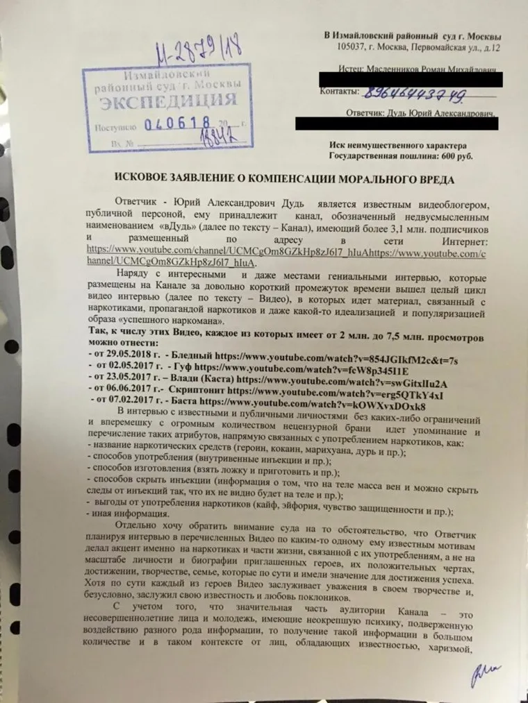 — Ройзман рассказывал, как борется с наркоманией, практически остановил эпидемию [ВИЧ] в Екатеринбурге. А те артисты, которых я указал в иске (рэперы Гуф, Скриптонит, Влади, Баста, Бледный, прим.ред.) выставляли себя героями, потому что справились с зависимостью. Разные посылы. У Ройзмана: «блин, это страшно». А у артистов он такой: «чувак, попробуй». Поэтому я и прошу удалить эти ролики. Если бы, допустим, Дудь взял пять интервью с увлекающимися [наркотическими веществами] и пять с борцами против наркомании, я бы понял. Но сейчас ситуация, когда один Ройзман против четырех «увлекающихся» — это ни в какие ворота.