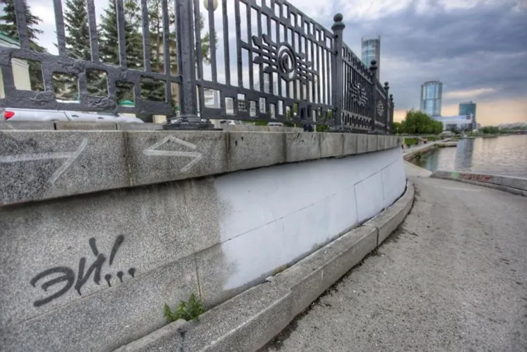 Сотрудники мэрии Екатеринбурга покрыли часть городской набережной серой краской. Как рассказали «URA.RU» собеседники в городской администрации, это сделано, чтобы скрыть оскорбительные граффити.