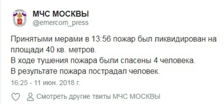 В оперативную дежурную службу Центра управления кризисных ситуаций Главного управления МЧС России по Москве сообщение о пожаре на улице 1-й Дубровской, 14, корп. 1, поступило 11 июня 2018 года, в 13:18 по мск. Об этом сообщается в официальном аккаунте ведомства в Twitter. Площадь пожара составила 40 кв. метров, его ликвидировали в 13:56. Были спасены четыре человека.