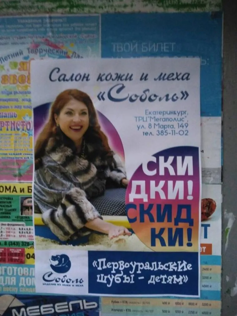 В объявлении, которое якобы принадлежит салону кожи и меха «Соболь», предлагают большие скидки. Также имеется надпись: «Первоуральские шубы — детям». В листовке указан адрес магазина, он располагается в екатеринбургском ТРЦ «Мегаполис». Снимок объявления с депутатом опубликовал портал Shaytanka.ru. В разговоре с «URA.RU» представители салона заявили, что подобную рекламу они не заказывали и не знают, чьи эти листовки. Получить оперативный ответ от самой Воробьевой на момент публикации заметки не удалось.