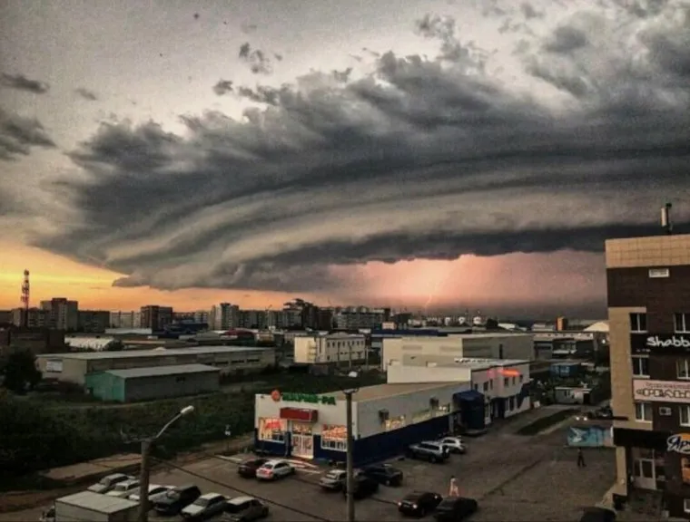 Над городом образовалась устрашающая облачная воронка с грозовым фронтом