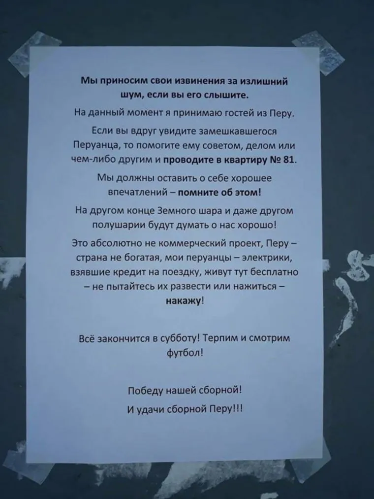 Программист из Екатеринбурга Владимир Хакимов на неделю приютил у себя двух электриков из Перу, которые прилетели на матч своей сборной в Екатеринбург. Уралец не взял с иностранцев ни копейки и даже повесил в подъезде объявление для соседей с просьбой не обижать гостей.