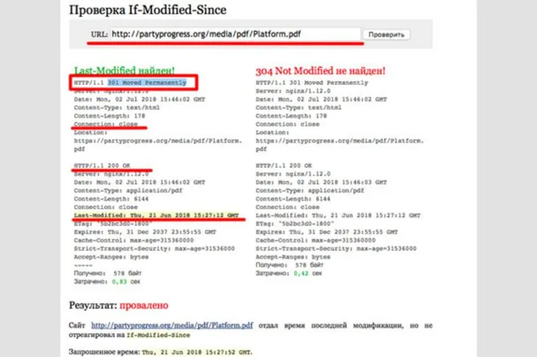 Применяемая в настоящий момент ссылка была создана и последний раз изменена 21 января 2018 года (параметр last-modified) — такой вывод можно сделать на основании данных сервисов по проверке последнего времени модификации сайта. Ошибка «301 Moved Permanently» показывает, что страница была удалена или скрыта веб-мастером. Еще одна проверка через ввод ссылки в поисковую строку Google или «Яндекса» показывает, что индексации страницы нет — это подтверждает утверждение о ее сокрытии или удалении.