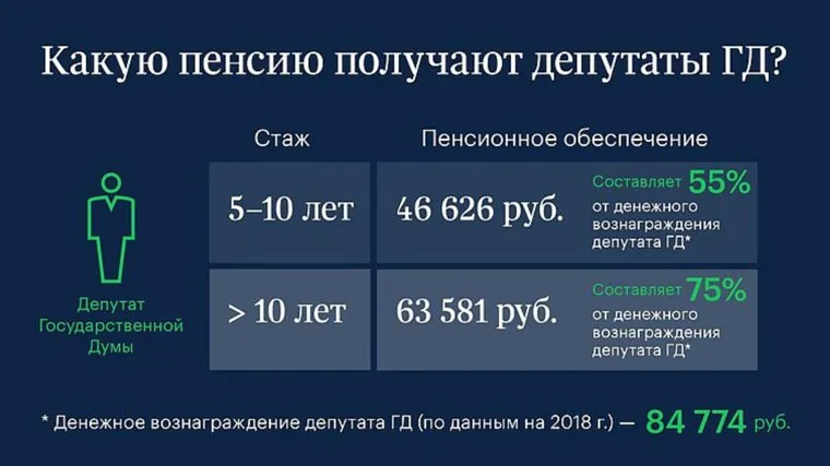 Исходя из опубликованных данных, депутат Госдумы, отработавший полностью один или два созыва (от пяти до 10 лет), может рассчитывать на доплату к пенсионному обеспечению. Эта доплата должна быть такой, чтобы пенсия составляла не менее 55% «денежного вознаграждения депутата», которое в 2018 году установлено на уровне 85 774 рублей. Таким образом, депутат, отработавший от пяти до десяти лет, будет получать на пенсии 46 626 рублей. Те же, кто отработал более десяти лет, будут получать на заслуженном отдыхе 75% от «денежного вознаграждения депутата» — 63 581 рубль. В случае, если гражданин был парламентарием менее пяти лет, доплату к пенсии он не получает.