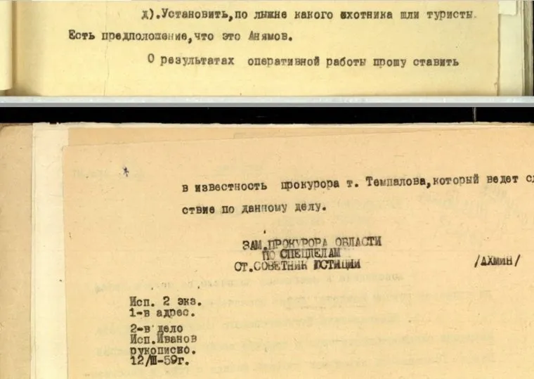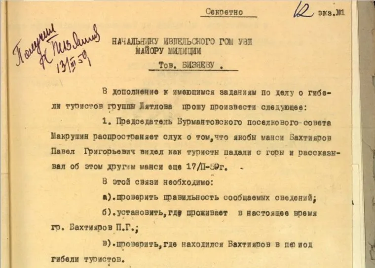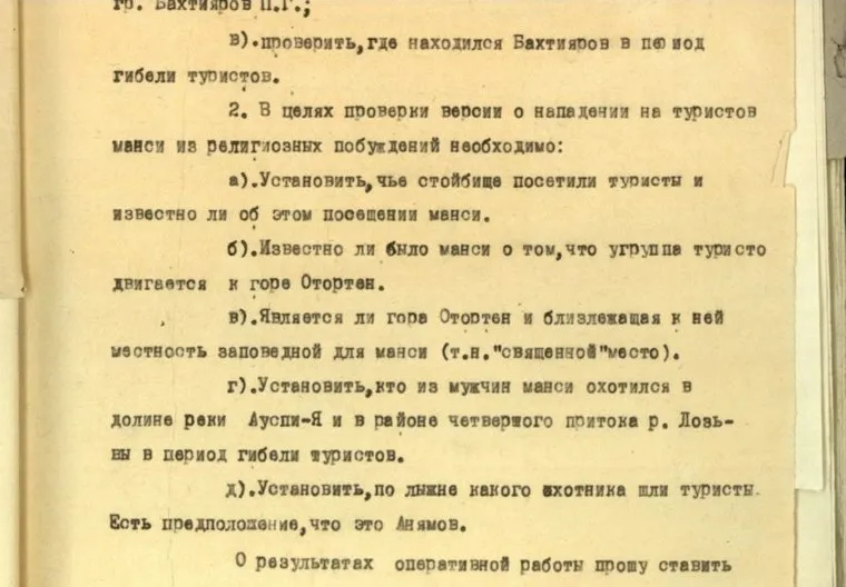 Среди документов — распоряжение начальнику милиции города Ивделя проверить правдивость слов манси Павла Бахтиярова, который якобы видел падающих с горы туристов. В этом же документе сообщается, что «дятловцы» шли по следу другого местного жителя — манси Анямова. Именно с этого момента в деле начинают копиться «однотипные свидетельские показания», что манси не нападают на туристов, а их священная гора якобы расположена в другом месте, замечает Дегтерев. По его мнению, налицо очевидный саботаж расследования.