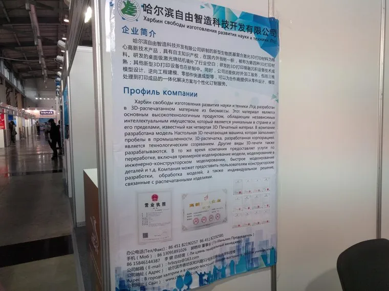 А вот китайские предприниматели из Харбина пытаются наладить продажу 3D-принтеров. «Харбин свободы изготовления развития науки и техники Лтд разработан в 3D-распечатанном материале из биомассы. Этот материал является основным высокотехнологичным продуктов, обладающим независимым интеллектуальным имуществом, который является уникальным в стране и за его пределами, известный как четвертая 3D Печатный материал», — объяснились китайцы перед посетителями.