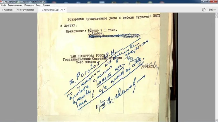 Также исследователь узнал, что уголовное материалы дела о гибели туристов засекретили 1 июля 1959 года. Документ, указывающий на это, из общего доступа убрали, однако Дегтереву удалось его разыскать. В бумаге говорится, что из Москвы вернули один том дела и фотоальбом, причем третий пункт — опись документов — из документов вычеркнут. На Урал документ пришел с резолюцией засекретить дело и хранить его в специальном хранилище в конверте.