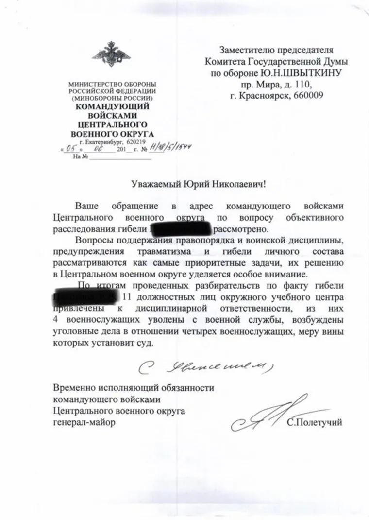 «По итогам проведенных разбирательств по факту гибели …11 должностных лиц привлечены к дисциплинарной ответственности, из них 4 военнослужащих уволены с военной службы, возбуждены уголовные дела в отношении четырех военнослужащих, меры вину которых установит суд», — говорится в письме от 5 июня 2018 за подписью генерала-майора Полетучего (который на тот момент исполнял обязанности командующего округом). По предварительной информации, один из военнослужащих арестован.