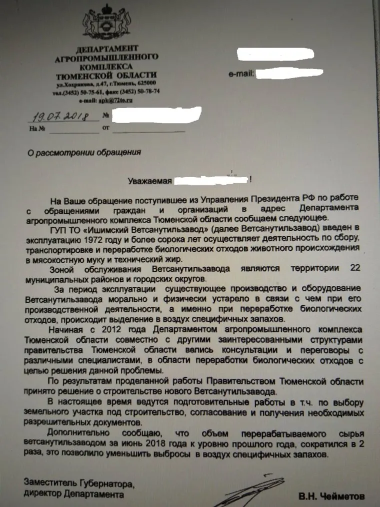 Параллельно выяснилось, что плохо пахнет в Ишиме не только из-за племзавода. Жительнице Ишима, направившей запрос в Управление Президента РФ по работе с обращениями граждан, пришел ответ из департамента агропромышленного комплекса Тюменской области. Директор департамента Владимир Чейметов напомнил, что расположенный рядом с Ишимом «Ветсанутильзавод», перерабатывающий отходы животного происхождения, технически устарел, в связи с чем «при переработке биологических отходов происходит выделение в воздух специфичных запахов». Областные власти думают над проблемой с 2012 года. Уже решено возводить новое профильное предприятие. Сейчас выбирается земельный участок под строительство, идет работа по согласованию и получению необходимых разрешительных документов.