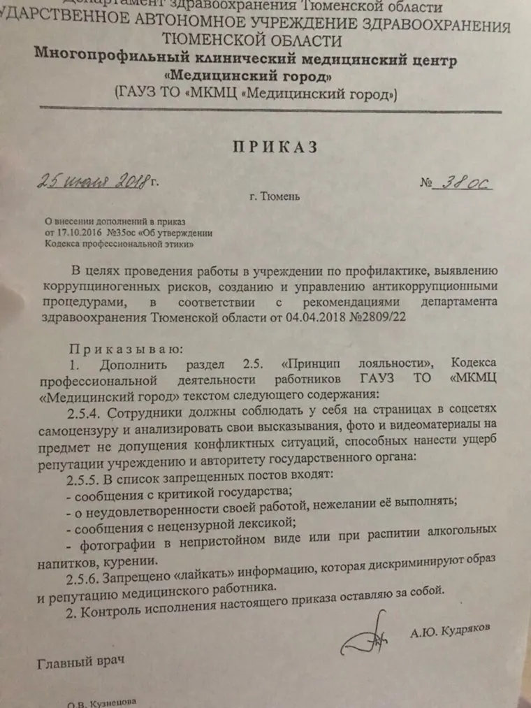 В Тюмени обсуждают приказ для работников МКМЦ «Медицинский город», которым рекомендовали ввести самоцензуру. Документ подписан главврачом, экс-директором департамента здравоохранения Тюменской области Андреем Кудряковым.