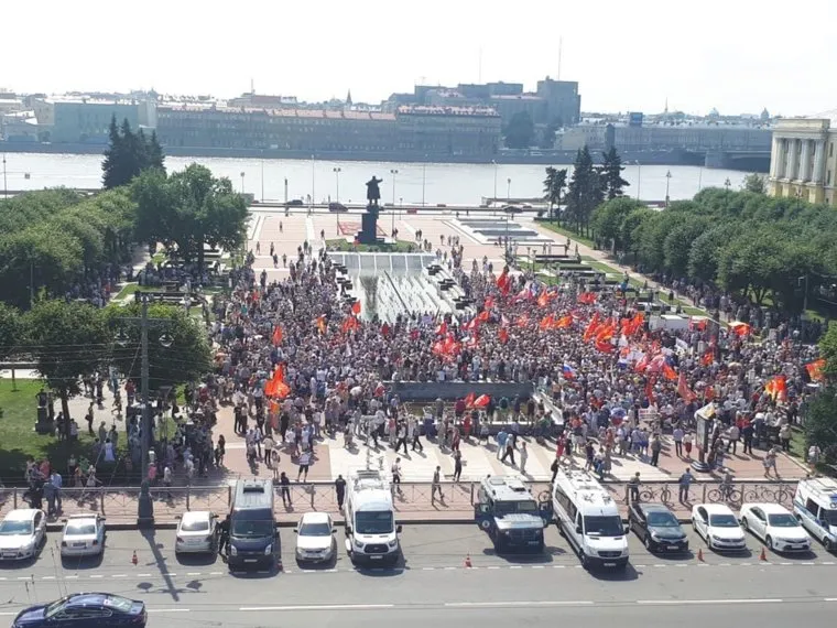 В северной столице, в отличие от Москвы, митинг собрал около 1000 человек, пишет «Фонтанка.ру». Демонстранты вышли на площадь Ленина. В Санкт-Петербурге это первое согласованное мероприятие против пенсионной реформы.