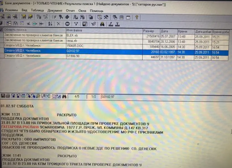 «31.01.97 в 13.00 на привокзальной площади при проверке документов у Гаттарова Руслана Усмановича 1977 г.р… студент ЧГТУ, было обнаружено и изъято удостоверение МО РФ с признаками подделки… обысков не проводилось. Подписка о невыезде», — говорится на скрине.