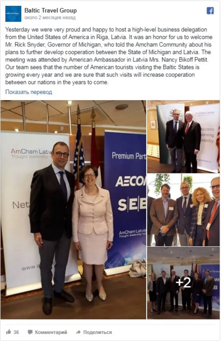 За день до встречи Навального и Корягина в Риге владелец BTG встречался с послом США в Латвии Нэнси Бикофф и губернатором штата Мичиган Риком Снайдерсом. В аккаунте компании опубликованы снимки с этой встречи. Она состоялась в честь годовщины совместных военных отношений США и Латвии. Одним из соорганизаторов был фонд AmCham Latvia. Это компания занимается налаживанием коммерческих отношений местного бизнеса с США. Основан фонд 27 инвесторами из Америки. В социальной сети Facebook (деятельность запрещена в РФ) указано, что «делегация высокого уровня» была приглашена Baltic Travel Group. После визита в Латвию Навальный отправился в Венгрию, Германию, а после — в США.