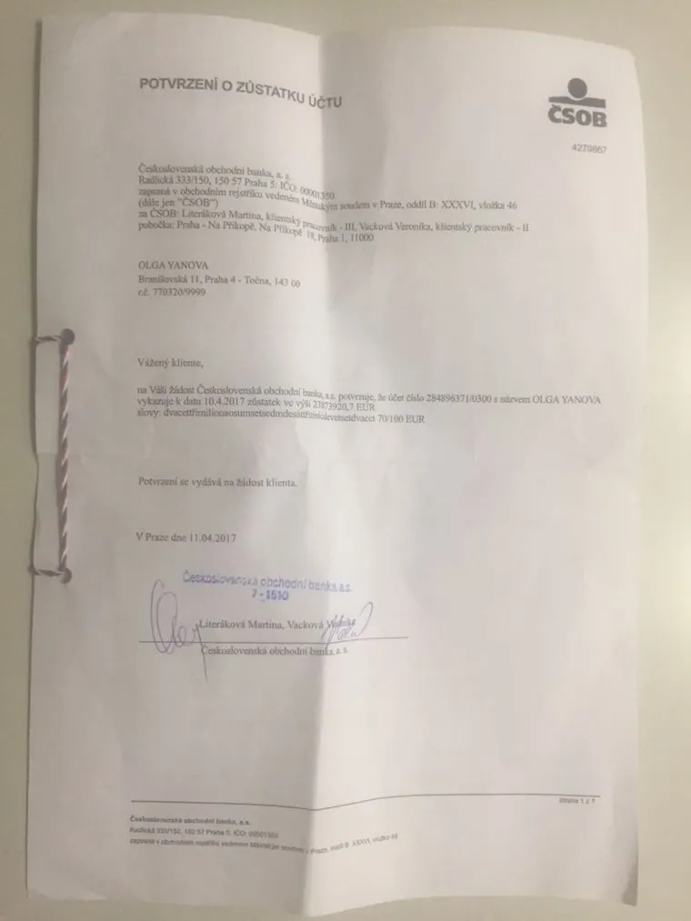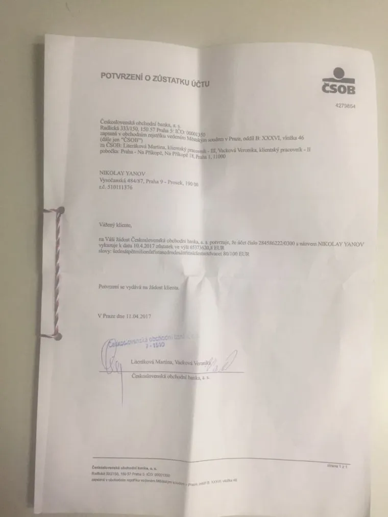Фото: Фото: выписка со счета Николая Янова в Чехословацком торговом банке