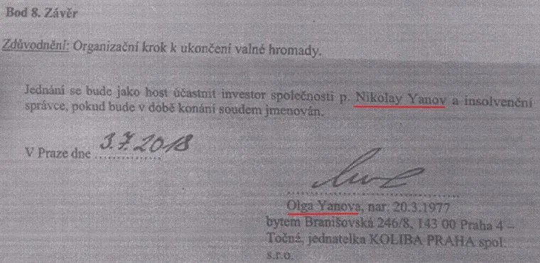 В повестке заседания несколько вопросов, включая утверждение отчетности за 2017 год и назначение руководителей компании. Сейчас исполнительным директором KOLIBA PRAHA является дочь челябинского депутата Ольга Янова. Что касается ее отца, то в конце приглашения подчеркивается статус Николая Янова как инвестора.