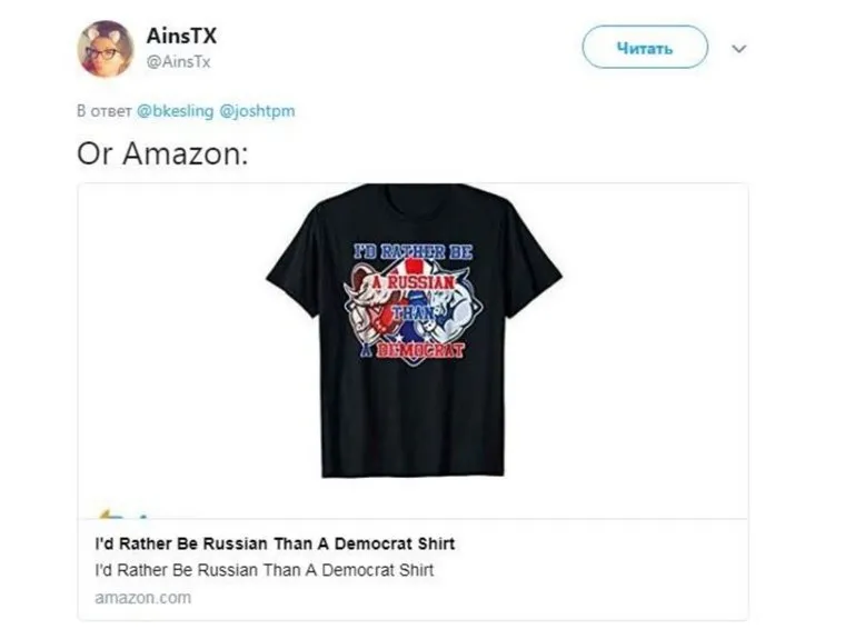 "Look, these T-shirts are now being sold in the United States and are in high demand in the Republican camp. It says, "I'd rather be a Russian than a Democrat." Note how the trends change with the times." ©? pic.twitter.com/vxOwwNAJmG
