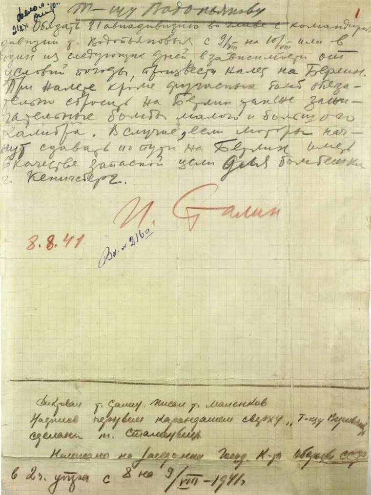 В документе указано, что 81-я авиадивизия во главе «с командиром дивизии т. Водопьяновым с 9.08 на 10.08 или в один из следующих дней» должна «произвести налет на Берлин», пишет . Сталин уточняет, что дата операции может меняться «в зависимости от условий погоды». Авиация СССР действительно совершила несколько налетов на столицу Германии. Некоторые лайнеры сумели добраться до Берлина и сбросить бомбы.