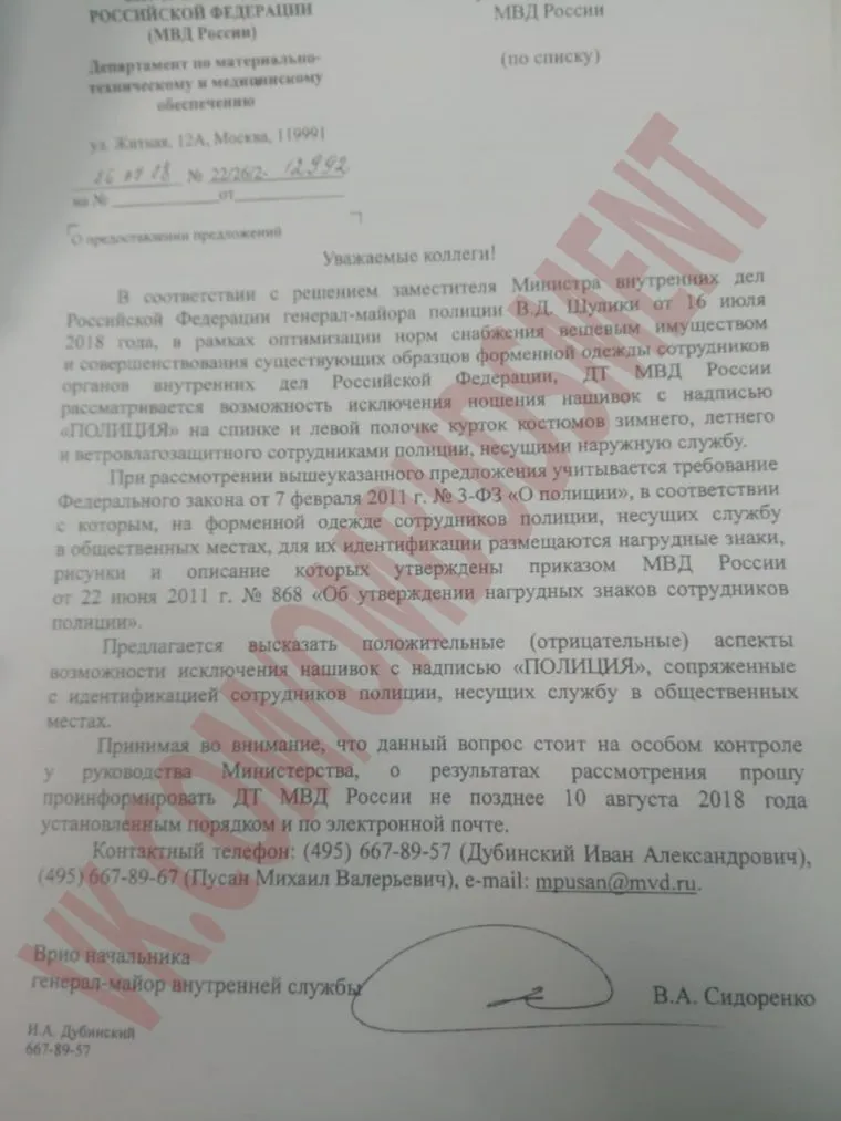 «В рамках оптимизации норм снабжения вещевым имуществом и совершенствования существующих образцов форменной одежды сотрудников органов внутренних дел Российской Федерации, ДТ МВД России рассматривает возможность исключения ношения нашивок с надписью „ПОЛИЦИЯ“ на спинке и левой полочке курток костюмов зимнего, летнего и ветровлагозащитного сотрудниками полиции, несущими наружную службу», — сказано в письме за подписью врио начальника департамента по материально-техническому и медицинскому обеспечению МВД, генерал-майора Виталия Сидоренко.