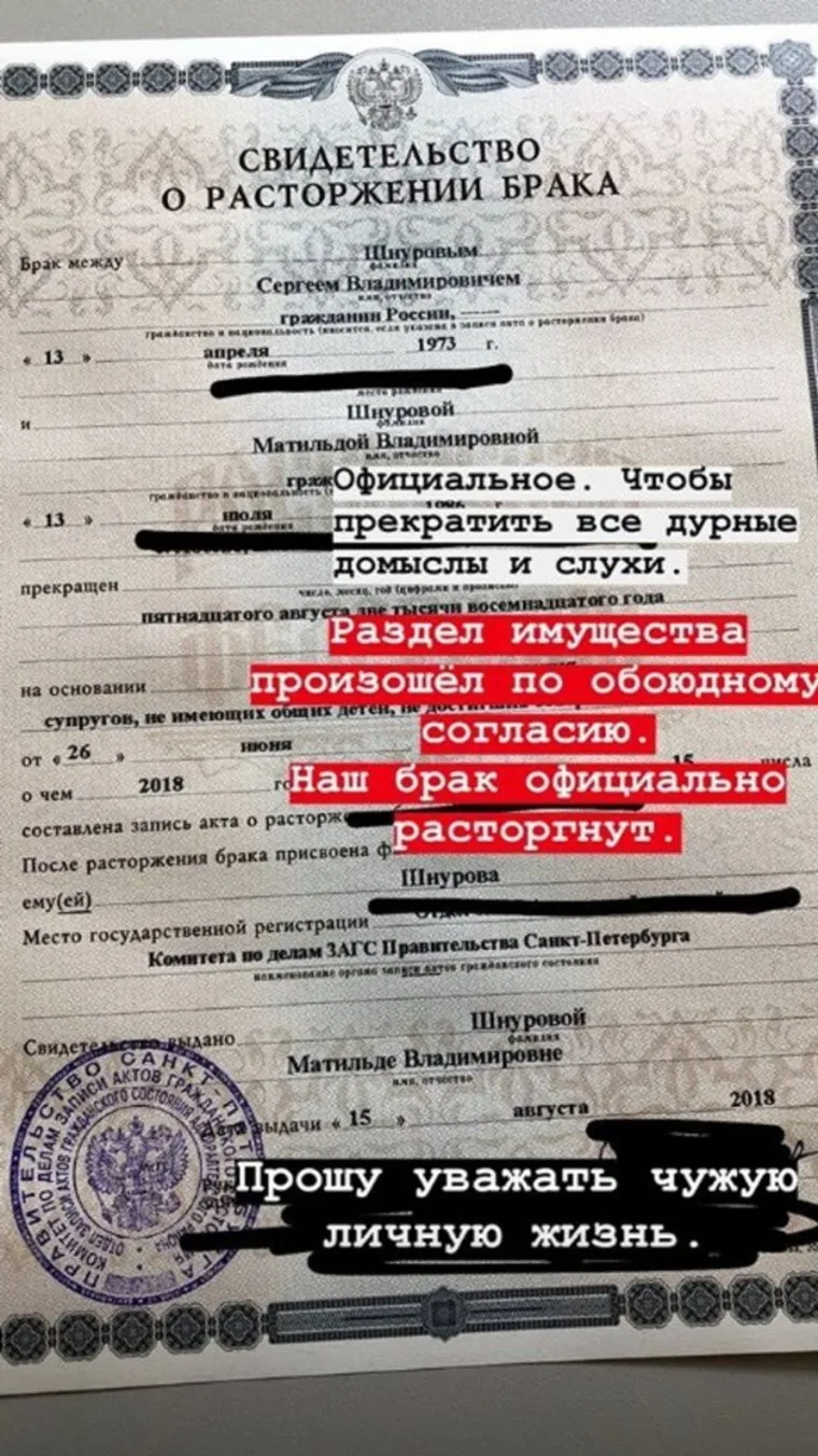 Сергей Шнуров и Елена Мозговая официально оформили развод. Свидетельство о расторжении брака Матильда (Мозговая) продемонстрировала своим подписчикам в Instagram (деятельность запрещена в РФ).